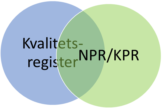 Figur 1 viser ulike utfall ved kobling av data fra kvalitetsregistre og NPR. Området merket med 2 er observasjoner som kan kobles og som derfor finnes både i kvalitetsregisteret og NPR. 1 angir observasjoner som kun er i kvalitetsregisteret, mens 3 er de som kun er i NPR.