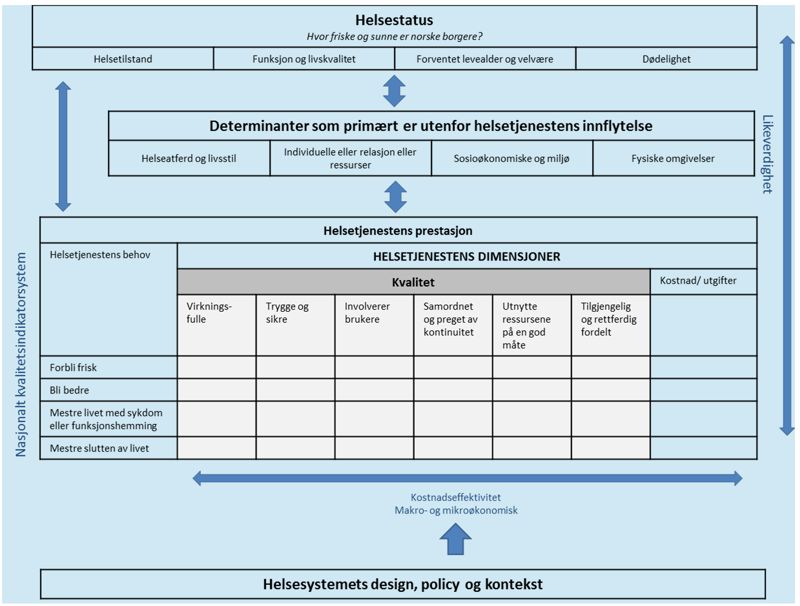 Internasjonalt har paraplyorganisasjonene Verdens helseorganisasjon (WHO) og Organisasjonen for økonomisk samarbeid og utvikling (OECD) ledet arbeidet med utvikling av helsetjenester av god kvalitet. Det nasjonale kvalitetsindikatorsystemet i Norge baserer seg på OECDs modell (se figur 1). I denne modellen defineres gode helsetjenester gjennom følgende seks kvalitetsdimensjoner: De skal være virkningsfulle, trygge og sikre, involvere brukere, være samordnet og preget av kontinuitet, utnytte ressurser på en god måte, og tjenestene skal være tilgjengelige og rettferdig fordelt.2,3