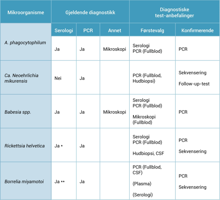 * Kan kryssreagere med andre Rickettsia spp. ** Kan ikke skilles fra andre bakterievarianter som gir tilbakefallsfeber