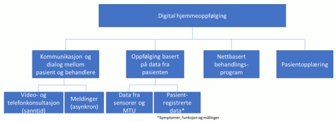 Figuren over visualiserer hva digital hjemmeoppfølging betyr i praksis. Forslaget til definisjon har til hensikt å romme en bredde av ulike former for digital oppfølging og samhandling mellom pasienten og helsetjenesten. Figuren bør oppdateres etter hvert som denne type tjenester utvikles videre.