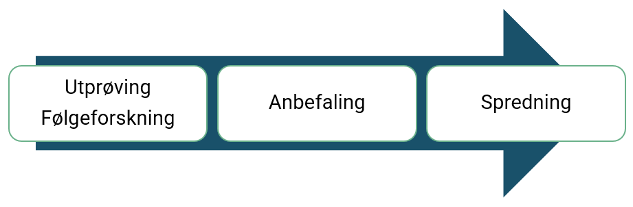 I løpet av programmets virketid har det tilkommet nye områder som har vært gjenstand for en systematisk utprøvning i de kommunale helse- og omsorgstjenestene. Det har blitt utført følgeforskning og øvrig forskning på oppnådde gevinster og virkninger av utprøvningen. Dersom det har vært grunnlag for det, har det så blitt gitt en nasjonalt normerende anbefaling om å ta den aktuelle velferdsteknologien og tilhørende arbeidsformen i bruk, f.eks. Nasjonalt faglig råd for velferdsteknologi til barn og unge[1] og Nasjonalt råd for digital hjemmeoppfølging[2]. Dernest har det blitt satt i gang implementerings- og spredningsaktiviteter for å øke utbredelsen av tiltaket.