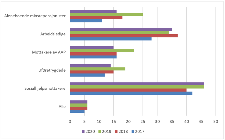 Indikatoren er hentet fra SSB-publikasjonen Økonomi og levekår for ulike lavinntektsgrupper, som igjen bygger på data fra levekårsundersøkelsene (Levekårsundersøkelsen EU-SILC). For mange gruppers vedkommende, varierer denne indikatoren mye fra år til år, og det er vanskelig å peke på noen klare utviklingstrender over tid. Dette skyldes til dels at gruppene vi her har valgt å se på, er små. Figuren kan derfor gi inntrykk av at endringene fra år til år er større enn de faktisk er. Figuren sier likevel noe om ulikheter mellom noen utvalgte, sårbare grupper.