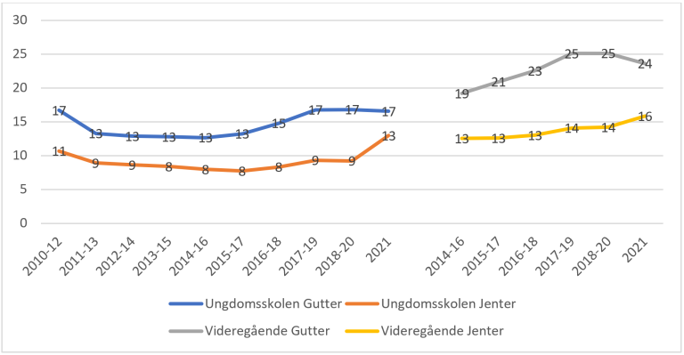 41 Anders Bakken: Ungdata 2020: Nasjonale resultater. NOVA Rapport 16/20, 2020. Lars Roar Frøyland mfl. Physical fighting and leisure activities among Norwegian adolescents—Investigating co-occurring changes from 2015 to 2018. Journal of Youth and Adolescence, 2020.