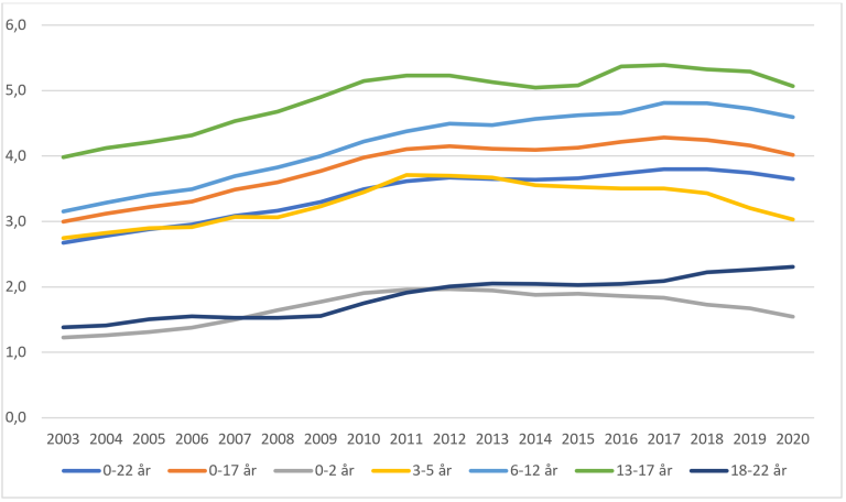 - Antall barn og unge med tiltak fra barnevernet i løpet av året, fordelt på aldersgrupper