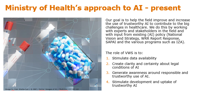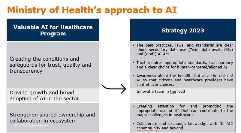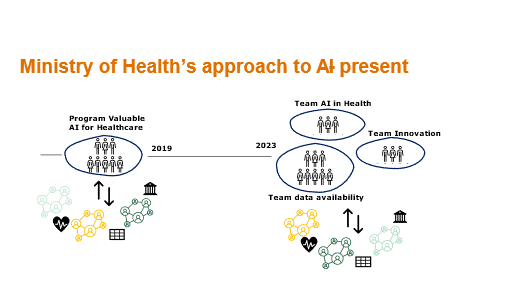 Figur 6: Organisering av nasjonalt KI-initiativ for helsetjenesten i Nederland: i 2019 og i 2023Figur 7: Leveranser fra «Program for valuable AI for healthcare» i NederlandFigur 8: Mål for KI i Helsedepartementet i NederlandFigur 9: Helsedepartementet i Nederland sin tilnærming til KI