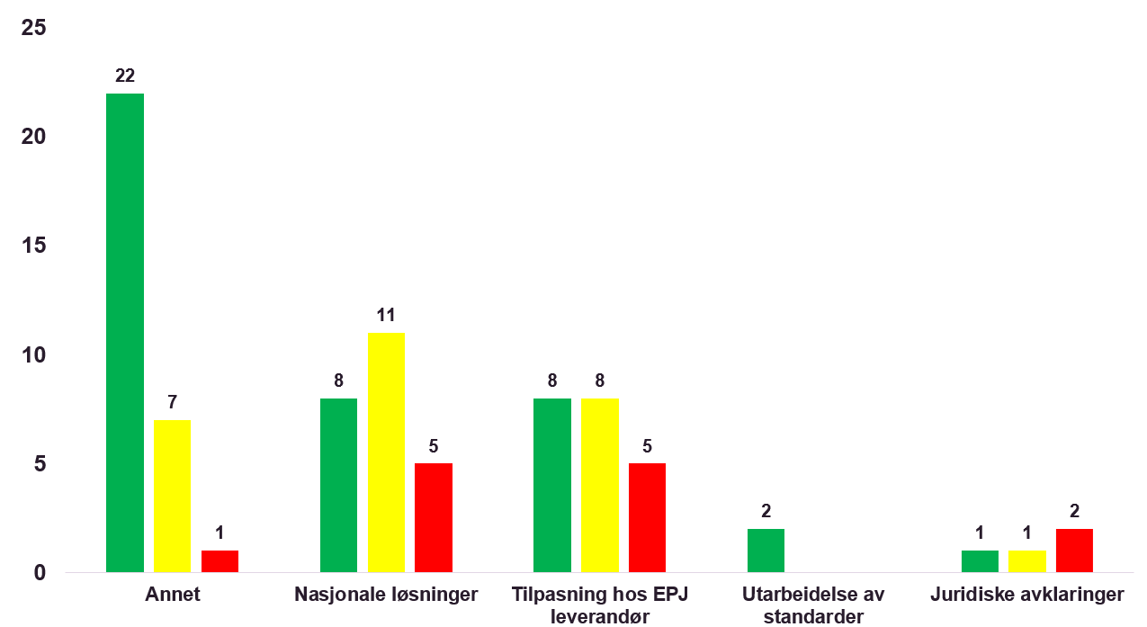 Tiltakene har rapportert totalt 155 avhengigheter som må oppfylles for å få gjennomført tiltakene iht. plan. Diagrammet under viser hvordan avhengighetene fordeler seg på kategori og status. Avhengigheter som ikke har en rød/gul/grønn status, vil ikke være synlig i diagrammet under.