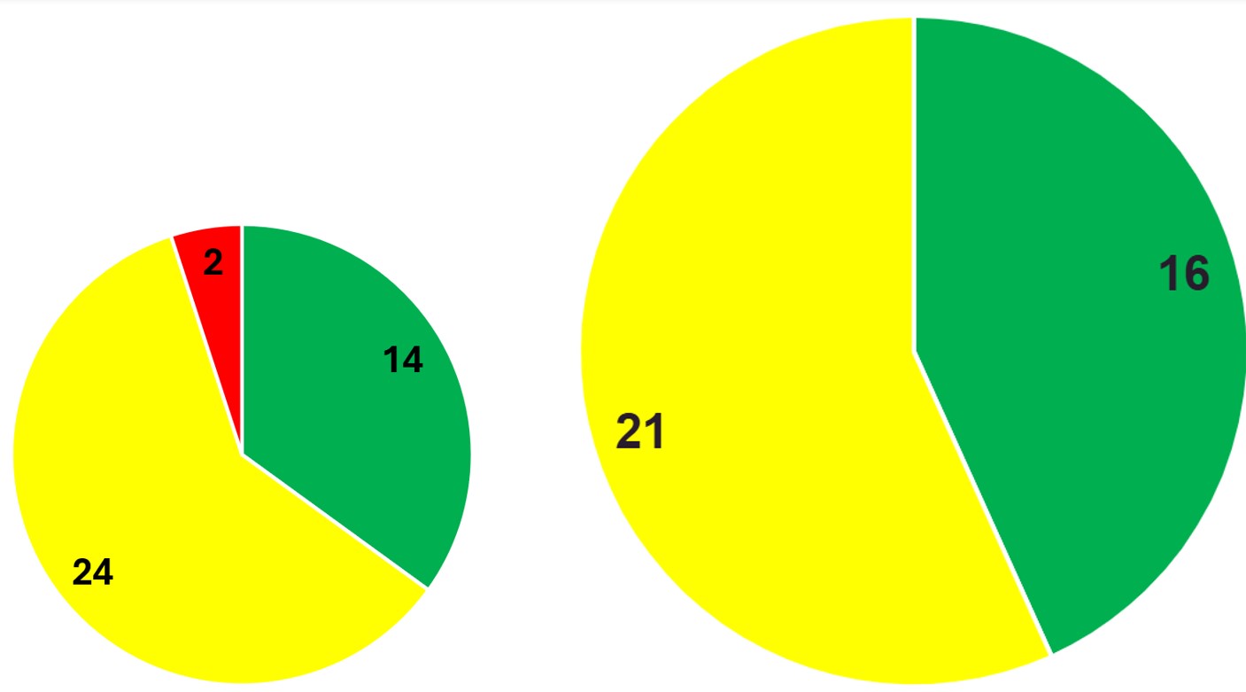 Det er ingen tiltak som melder rød risiko ved denne rapporteringen. Antall tiltak som melder gul risiko er synkende fra 27 til 21 ved rapportering i andre kvartal.