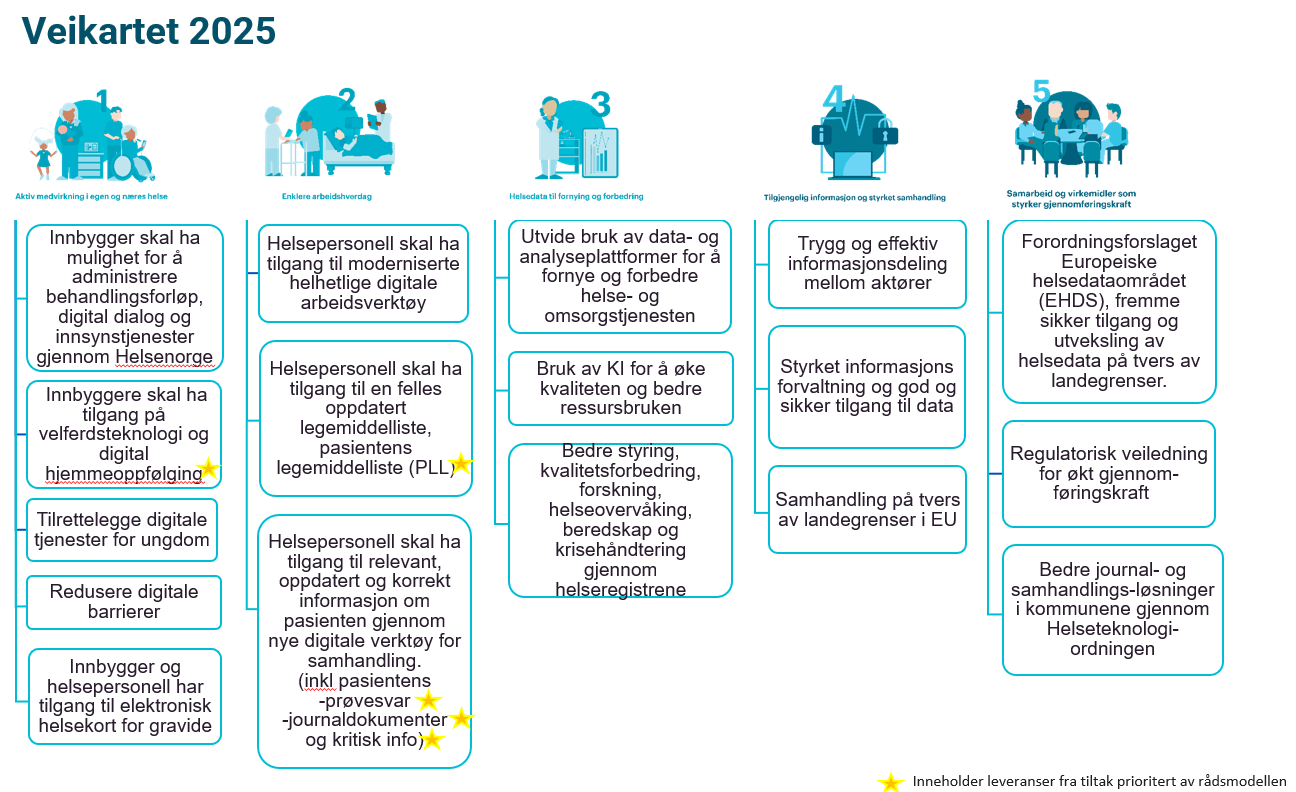 Veikartet for nasjonal e-helsestrategi viser planen for realisering av nasjonal e-helse strategi og hvilke delmål som det jobbes med og prioriteres. I møte 5. september anbefalte NUIT følgende overordnet veikart for 2025: