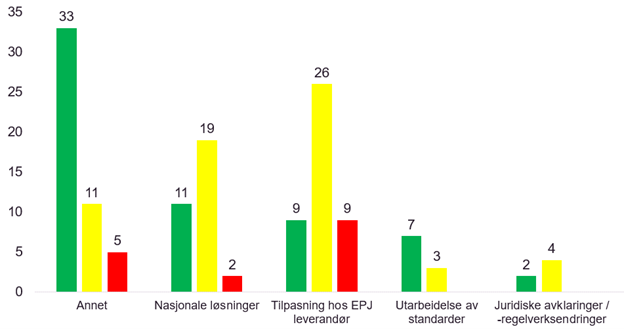 Det er totalt 20 avhengigheter med høy kritikalitet der fremdrift ikke er avklart. Til denne rapporteringen er det en kraftig økning i antall avhengigheter til kategoriene Nasjonale løsninger, Tilpasning hos leverandører og Annet, dette er et resultat av rapportering på tiltak innen digital samhandling fra flere aktører.