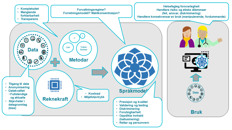 Utfordringar knyter seg til tilgang til og kvalitet på treningsdata, datakraft, miljøavtrykk, kostnad, nytte og risiko og validering. - Bruk av språkmodellar
