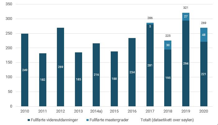 Kilde: DBH. a) OBS! Merk at tall for UiT mangler for 2014 (og for 2015, men UiT har normalt hatt veldig få eller ingen fullførte i oddetallsår). UiT-tallene for 2016-2020 er innhentet fra UiT (via LaH NSF). Se tabell 3 for fordeling på utdanningsinstitusjon.