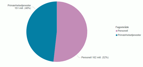 Figuren nedenfor viser at tilskuddene fordeler seg omtrent likt mellom fagområdene personell og primærhelsetjeneste. Midlene på personellområdet går i all hovedsak til kommuner som mottar leger i første del av spesialistutdanningen (LIS1). På området primærhelsetjeneste tildeles midler for avtaleordningen for fastleger (ALIS-avtaler) og veiledning av leger i siste del av spesialistutdanningen (LIS3).