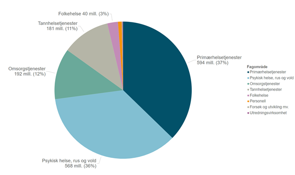 Figuren ovenfor viser at over 1/3 av tilskuddsmidlene ble tildelt på fagområdet primærhelsetjeneste, med styrking av helsestasjon- og skolehelsetjenesten som den største enkeltsatsingen. Fagområdet psykisk helse, rus og vold står også for om lag en tredjedel av tildelingene. I hovedsak er dette tilskuddsmidler til kompetansesentre som bistår kommunene på fagområdet og på mer avgrensede områder som vold, traumatisk stress og selvmord. Den gjenstående tredjedelen fordeler seg på omsorgstjeneste, tannhelsetjenester og tre mindre fagområder. Tannhelsetjenester, som er nytt fagområde for K2025, omfatter tilskuddsordninger for utdanning samt kunnskaps- og tjenesteutvikling.