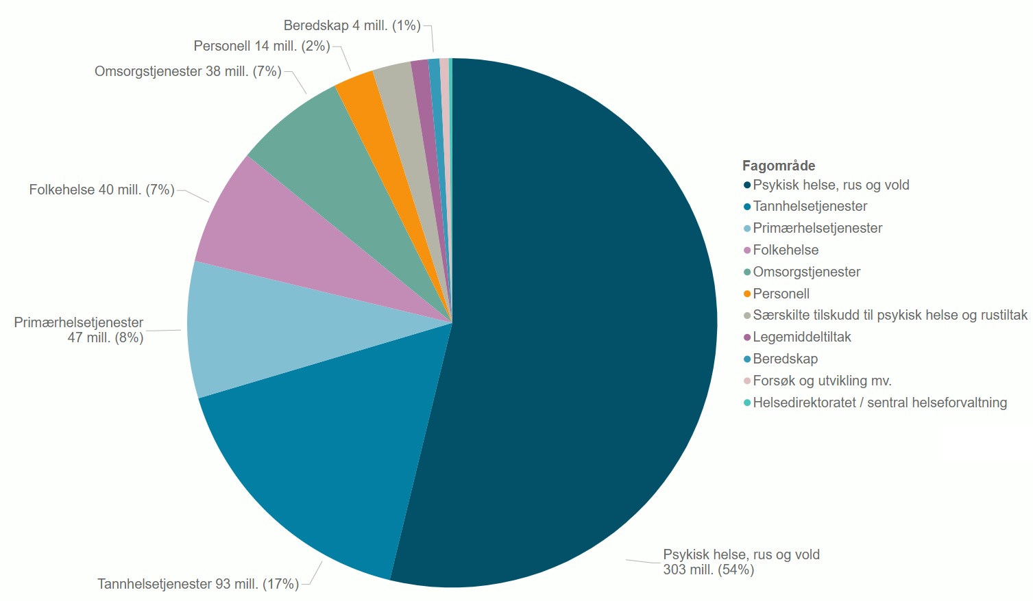 54 prosent av tilskuddene (303 mill. kr) er innen psykisk helse, rus og vold, 17 prosent (93 mill. kr) innen tannhelsetjenester og 8 prosent (47 mill. kr) innenfor primærhelsetjeneste.
