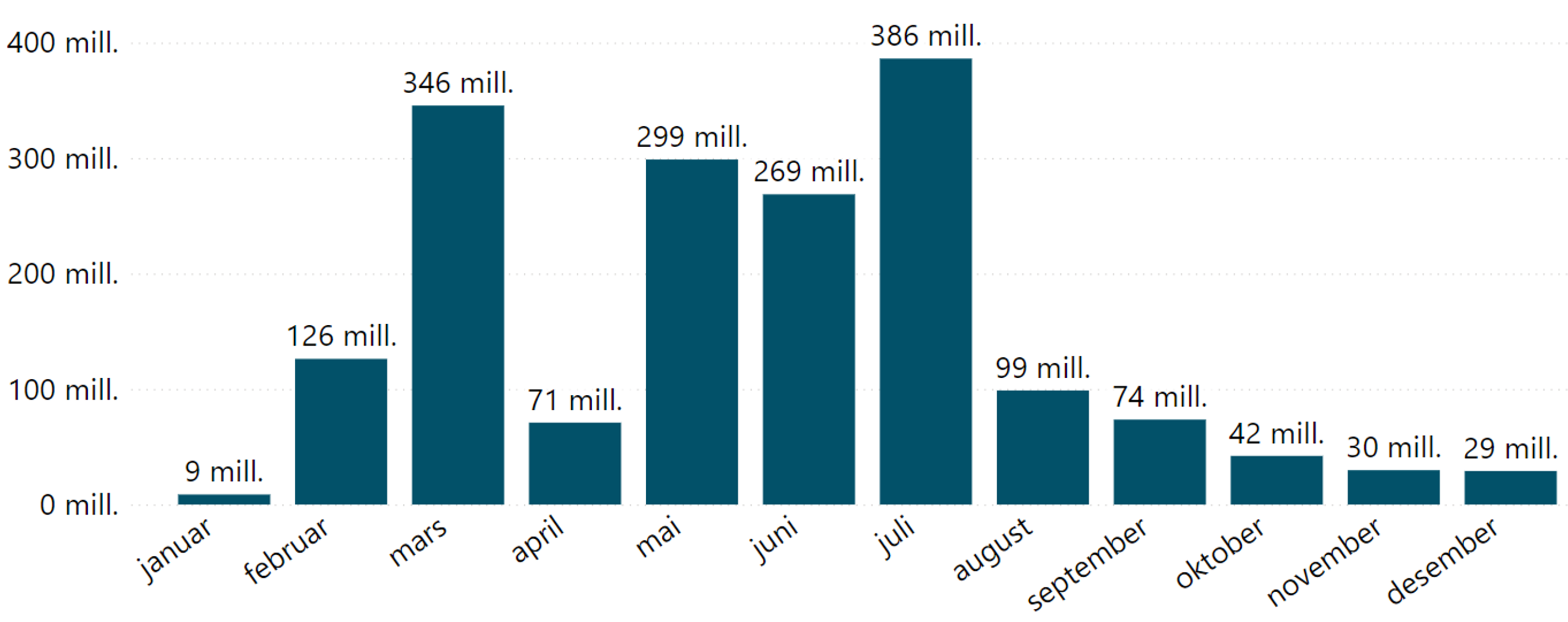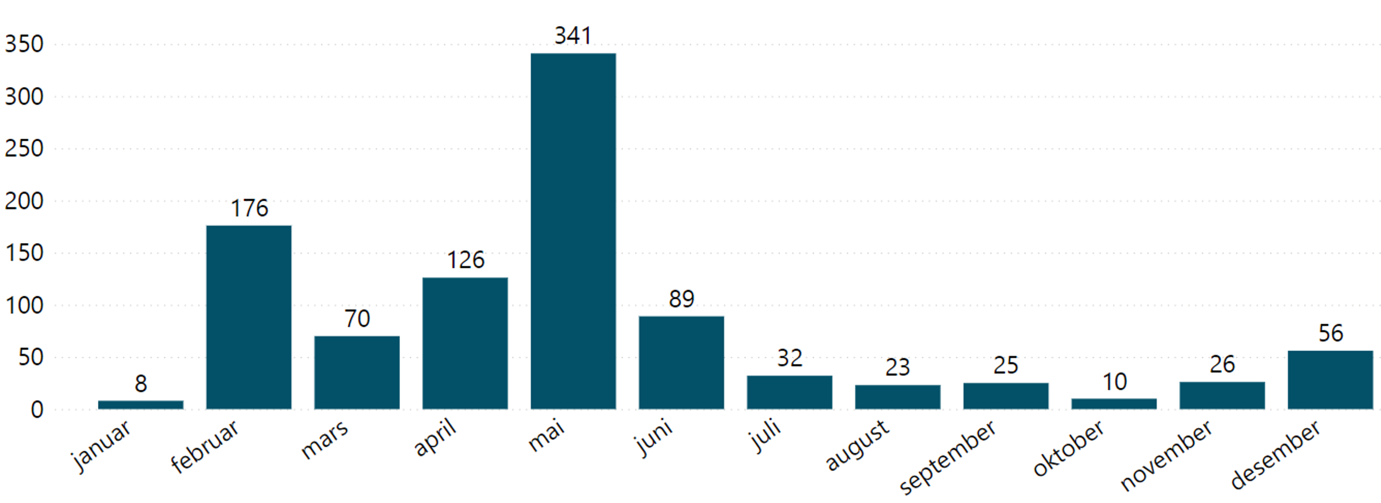 I tilskuddsforvaltningen blir det lagt vekt på å fatte vedtak om innvilget beløp så tidlig som mulig i kalenderåret. Hensikten er å gi tilskuddsmottaker mer forutsigbarhet. Dette er spesielt viktig for organisasjoner i frivillig og ideell sektor med anstrengt likviditet. Figur 1-25 viser når i 2022 tilskuddsmottaker får informasjon om resultat av søknadsbehandlingen.