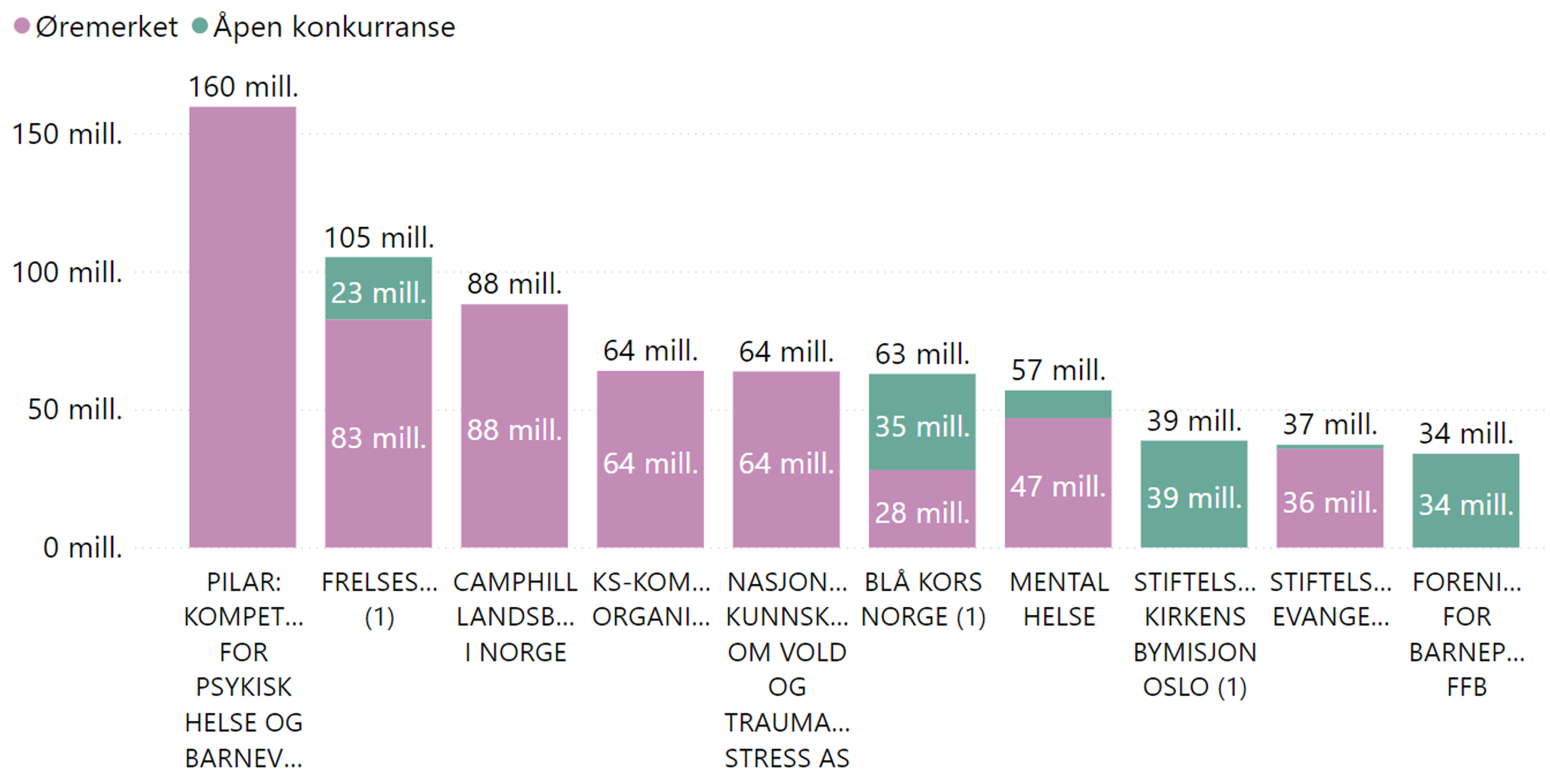 Figur 1-28 viser de ti organisasjonene og stiftelsene som fikk mest utbetalt i 2022. PILAR: Kompetansetjeneste for psykisk helse og barnevern fikk høyeste beløp på ca. 160 mill. kr over to øremerkede tilskuddsordninger, Regionale kunnskapssentre for barn og unges psykiske helse og Regionale ressurssentre om vold traumatisk stress og selvmordsforebygging. Frelsesarmeen fikk neste høyeste beløp på ca. 105 mill. kr over fem tilskuddsordninger med åpen konkurranse. Deretter følger Camphill landsbystiftelse i Norge som fikk ca. 88 mill. kr.