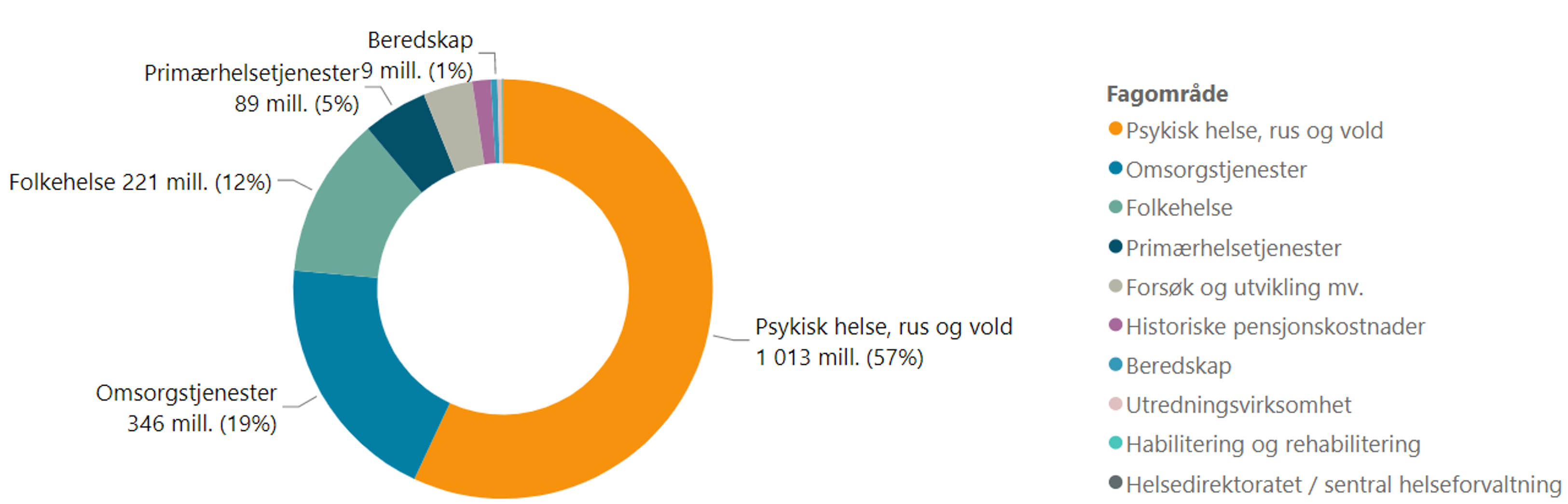 Tilskuddsmidlene utbetales over fagområdene Psykisk helse, rus og vold (59 prosent), Folkehelse (14 prosent), Omsorgstjeneste (13 prosent) og Primærhelsetjenester (6 prosent).