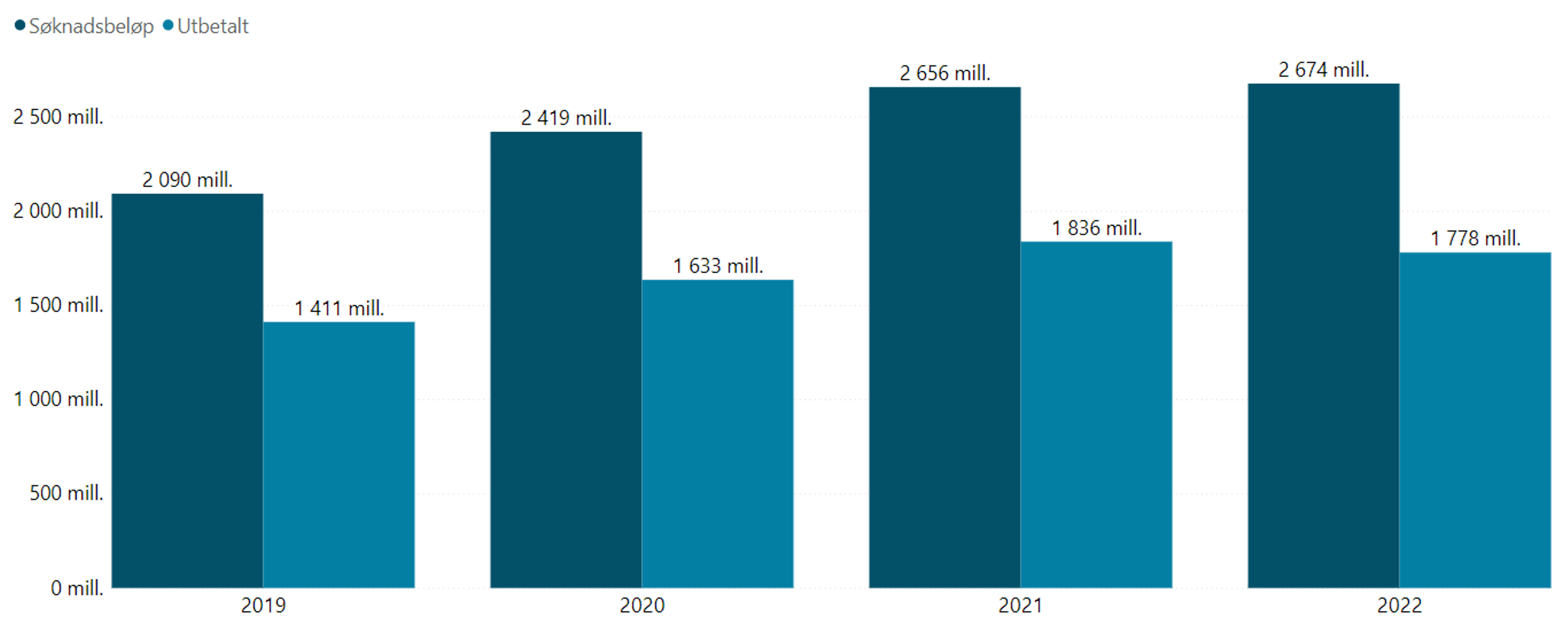 Basert på kriteriene 1 og 2 har vi mottatt 571 søknader på 64 tilskuddsordninger fra 290 søkere. Søknadsbeløpet er 1 726 mill. kr og utbetalt beløp i 2022 er 1 229 mill. kr.