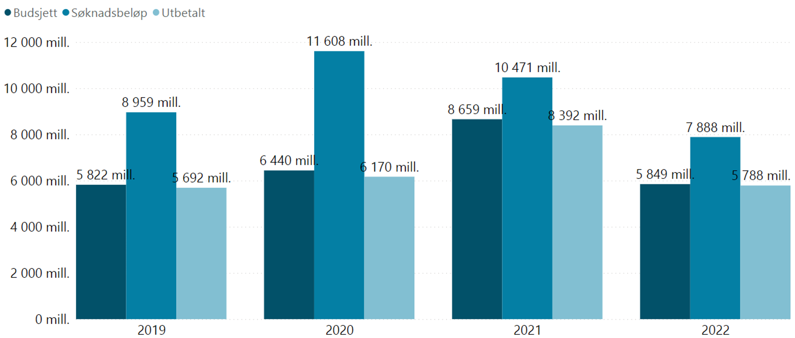 Kategori | Sum budsjett | Sum utbetalt | Antall tilskuddsordninger |