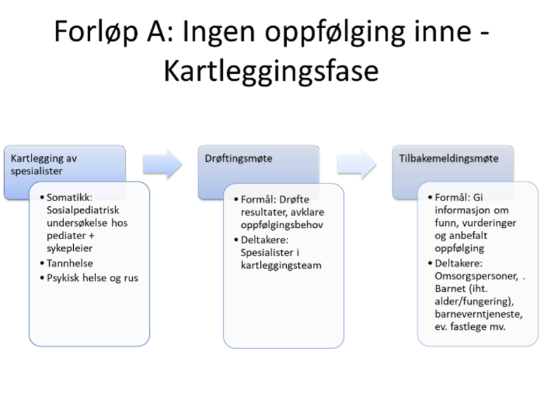 Under følger en fremstilling av et mulig felles rammeverk for ulike helsekartleggingsforløp. I figuren under benyttes begrepet "oppfølging inne". Dette innebærer at helsetjenesten allerede følger opp barnet i form av utredning og/eller behandling/oppfølging. Se vedlegg 3 (protokoll) for detaljert beskrivelse av de ulike fasene.