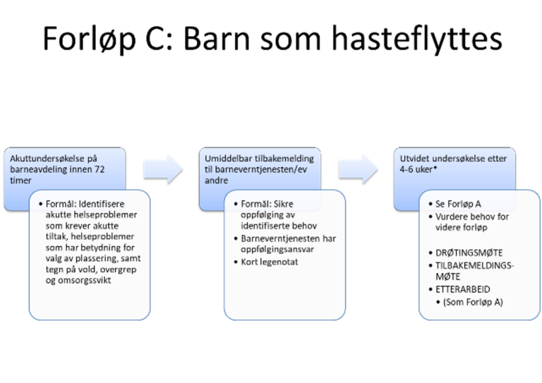 - Forløp C – Hasteflytting – det oppstår en situasjon hvor barnet må flyttes ut av hjemmet på kort varsel. Uavklart om og ev hvilke tjenester som ev. er koblet på.