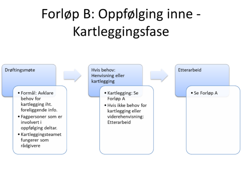 Jf. modeller for ulike forløp innledningsvis i kapittelet knyttet til ev oppfølging og omstendigheter rundt flytting, kan en kartleggingsfase deles i ulike forløp.
