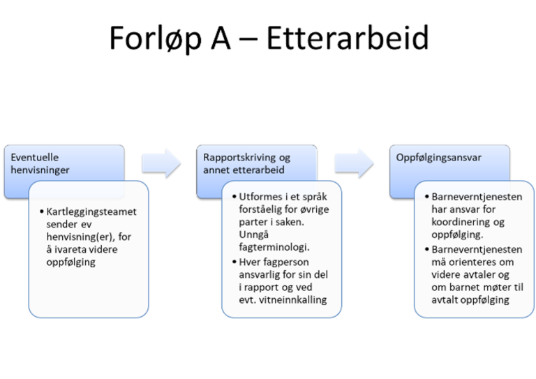 Som nevnt anbefaler Helsedirektoratet at kartleggingsteamet henviser videre dersom det avdekkes behov for videre oppfølging. For barn som henvises til spesialisthelsetjenesten vil det være oppfølging i form av utredning og/eller behandling og spesialisthelsetjenesten innkaller barnet. For å sikre kontinuitet i oppfølgingen, er det viktig å sikre informasjonsflyt med epikriser til fastlege og helsestasjons- og skolehelsetjeneste, ev andre som skal følge barnet videre etter avsluttet utredning/behandling i spesialisthelsetjenesten.