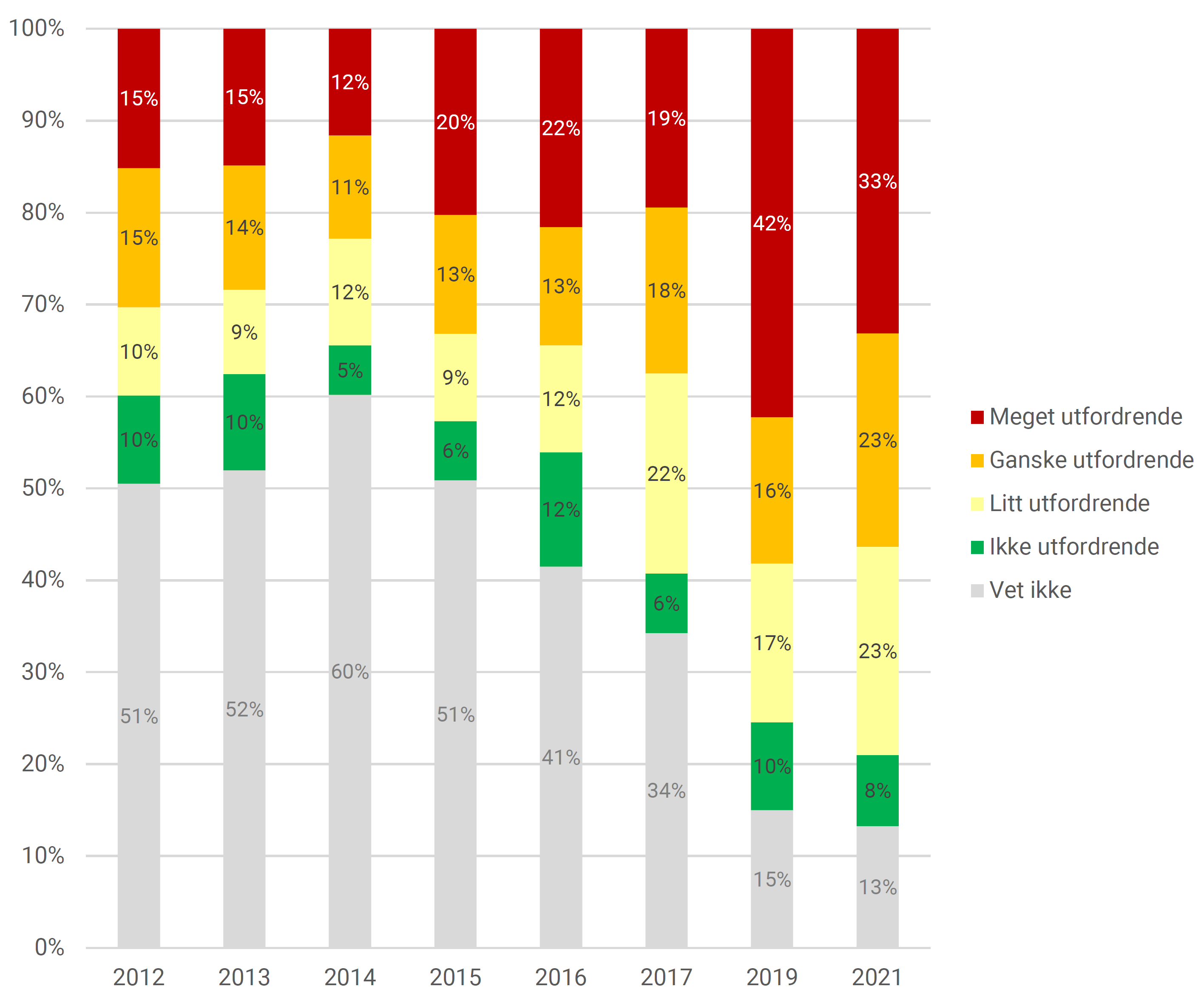 | Litt utfordrende | 19 | 21 | 28 | 22 | 28 | 47 | 38 | 41 |