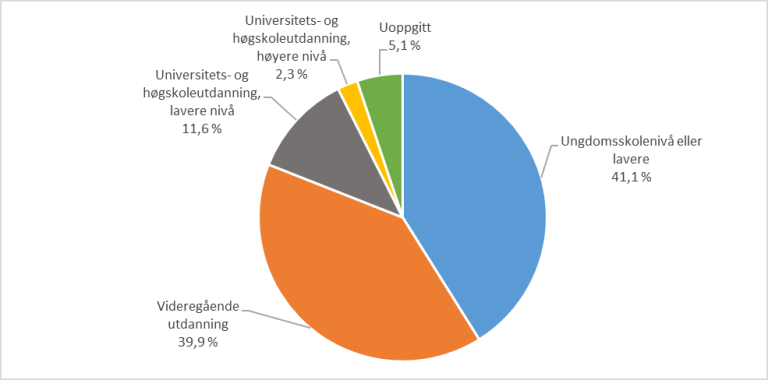 I figur 6 presenteres utdanningsnivået blant personell uten helse- og sosialfagligutdanning. Som tidligere årsrapporter har beskrevet er det bekymringsfullt at utdanningsnivået er gjennomgående lavt i denne personellgruppen. En liten andel har høyere utdanning på lavere eller høyere nivå, men over 40 prosent har utdanning på ungdomsskolenivå eller lavere. Helsedirektoratet ser med bekymring på at det er andelen med lavere utdanningsnivå og uoppgitt utdanningsnivå som øker mest det siste året, både med hensyn til årsverk og antall sysselsatte. Uoppgitt utdanningsnivå innebærer trolig lavere utdanning, da denne kategorien i stor grad stammer fra personell med innvandringsbakgrunn hvor utdanningsnivået er ukjent. I omsorgstjenestene skilles det ikke alltid på oppgaver etter utdanningsnivå, og personell med lav kompetanse pleier derfor multisyke pasienter med stort bistandsbehov. Behovet for kompetanseheving er stort, samtidig som et lavt utdanningsnivå i gruppen kan gjøre det krevende.