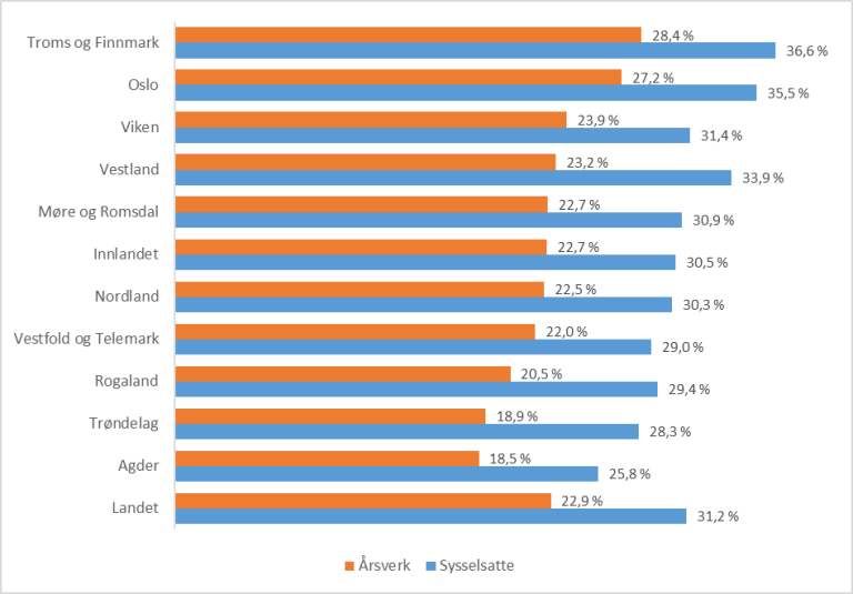 Som det fremgår av figur 5 er det stor variasjon i andelen personell uten helse- og sosialfaglig utdanning i de ulike fylkene. Troms og Finnmark og Oslo skiller seg ut med betydelig høyere andel personell uten helse- og sosialfagligutdanning, mens Trøndelag og Agder har lavest andel.