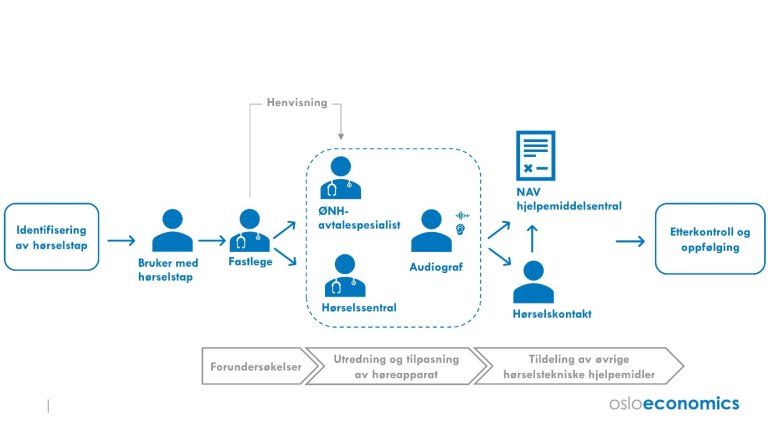 I dette kapittelet omtales dagens organisering av tilbudet til personer med aldersbetinget hørselstap. Det er noe variasjon i hvordan tilbudet til hørselshemmede er organisert i kommuner og helseforetak, og det er mange ulike aktører involvert i hørselsomsorgen. Hvilke aktører som er involvert, avhenger også av alderen til den hørselshemmede, samt hvilke utfordringer personen opplever knyttet til hørselshemningen. Illustrasjonen nedenfor viser pasientforløpet i hovedtrekk.
