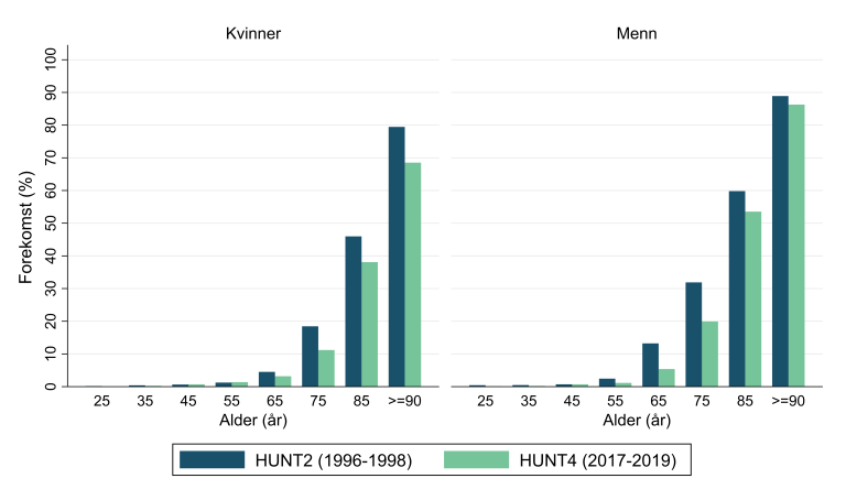 Nye tall fra Helseundersøkelsen i Nord-Trøndelag i 2017-2019 (HUNT4) (1) viser at i 2018 hadde om lag seks prosent av den voksne befolkningen i Norge et invalidiserende hørselstap2 etter definisjonen til "Global burden of disease" (GBD) (>=35 dB) (2) noe som tilsvarer om lag 236 000 personer. Andelen hørselstap ved en gitt alder er betydelig redusert siden undersøkelsen i 1996-1998 (Figur 1). Antallet personer i Norge med enten mildt (>20 dB) eller ensidig hørselstap[1], anslås basert på HUNT4 til å utgjøre 18% eller 725 000 voksne personer i 2018. Estimatene for milde hørselstap er imidlertid usikre, og de fleste har lite behov for behandling. Med SSB sin framskrivning vil antallet med en invalidiserende grad[2] av hørselstap antakeligvis øke med 40% til år 2030 og nesten dobles til år 2040. Dette skyldes en stor økning i antall eldre, og forutsetter at hørselen ved en gitt alder holder seg på dagens nivå og ikke bedres ytterlige.