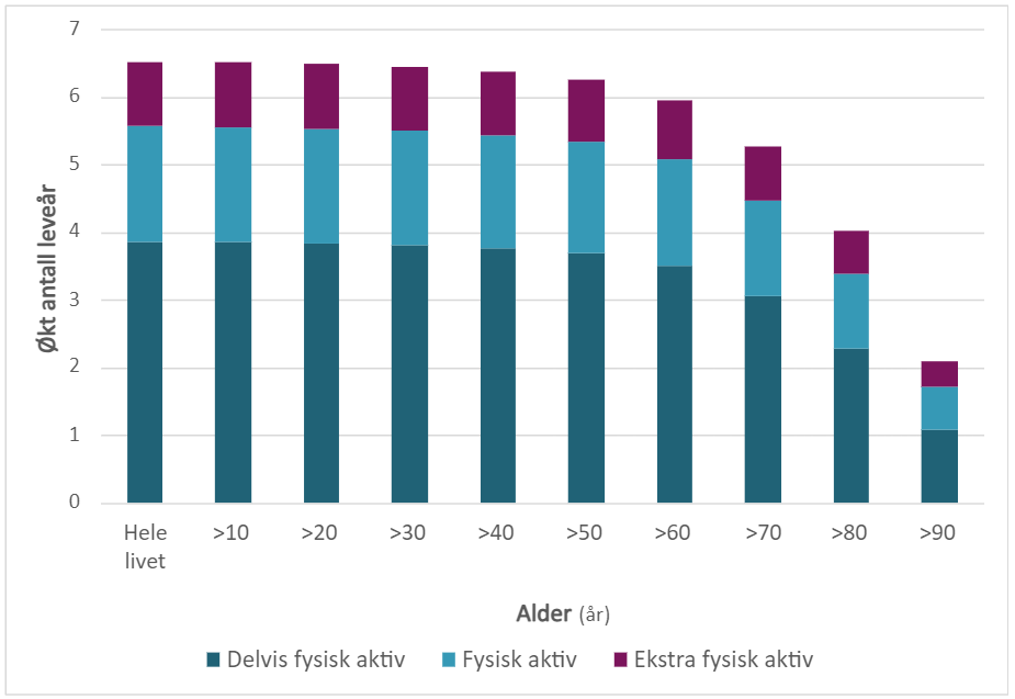 Figur 4 og figur 5 oppsummerer resultatene i tabell 3, 4 og 5 for henholdsvis vunne leveår og DALYs. At det er avtagende grensenytte, som det gjerne omtales i økonomisk terminologi, av økt fysisk aktivitetsnivå fremgår av figurene. Med det menes at gevinsten er størst per tidsenhet, og/eller per annen ressursbruk, brukt på fysisk aktivitet, ved å gå fra å være fysisk inaktiv til å bli delvis fysisk aktiv. Deretter er det fortsatt betydelige gevinster å hente ved å øke til høyere aktivitetsnivåer, men disse gevinstene er samlet sett trolig mindre per tidsenhet anvendt.