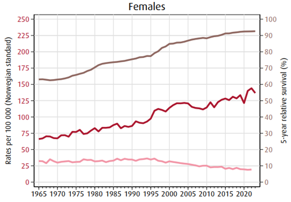 For årene 2019-2023 var fem års relativ overlevelse 101.2 % ved stadium I (svulststørrelse ≤ 2 cm uten spredning til lymfeknuter) mot 41.8 % hvis det forelå fjernspredning på diagnosetidspunktet. Brystkreftpasienter har en klar overdødelighet i mer enn 20 år etter at diagnosen er stillet. Ett år etter operasjon er 98,2 % i live. Etter 15 år er 83.6 % i live (Larsen, 2024).
