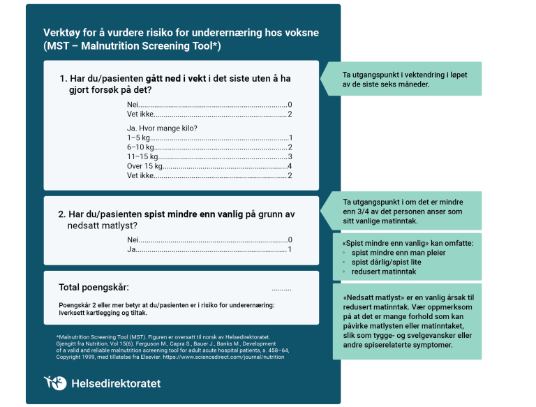 Helsedirektoratet (2022). For å vurdere risiko for underernæring anbefales verktøyet MST (Malnutrition Screening Tool) [nettdokument]. Oslo: Helsedirektoratet (siste faglige endring 09. oktober 2024, lest 18. desember 2025). Tilgjengelig fra https://www.helsedirektoratet.no/retningslinjer/forebygging-og-behandling-av-underernaering/vurdering-av-risiko-for-underernaering/for-a-vurdere-risiko-for-underernaering-anbefales-verktoyet-mst-malnutrition-screening-tool