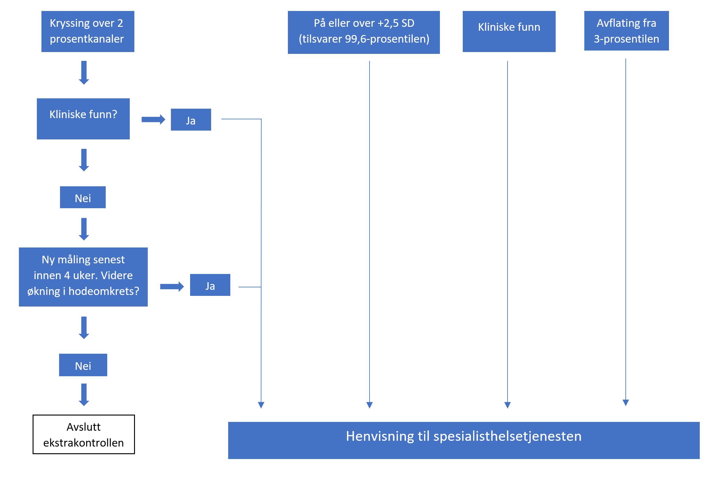 Nasjonal vekstkurve fra Vekststudien i Bergen (2009) bør benyttes for vurdering av hodeomkrets, da sammenlikning viser at den norske vekstreferansen for hodeomkrets ligger over WHOs vekststandard (Júlíusson et al., 2009). Hodeomkrets er vist å variere mellom ulike land og etniske grupper, og europeiske barn har gjennomsnittlig større hodeomkrets enn referansen i WHOs vekstkurve (Natale et al., 2014).