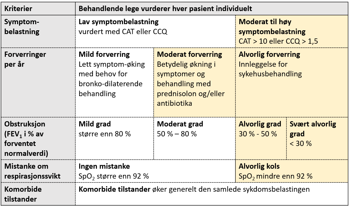 Pasienter med kols har varig luftstrømobstruksjon, symptomene er kroniske og noen har episodiske forverringer. Pasienter som oppsøker legevakt for akutte luftveisinfeksjoner med symptomer og tegn til obstruksjon og som har uavklart diagnose, henvises for vurdering i stabil fase hos fastlege.