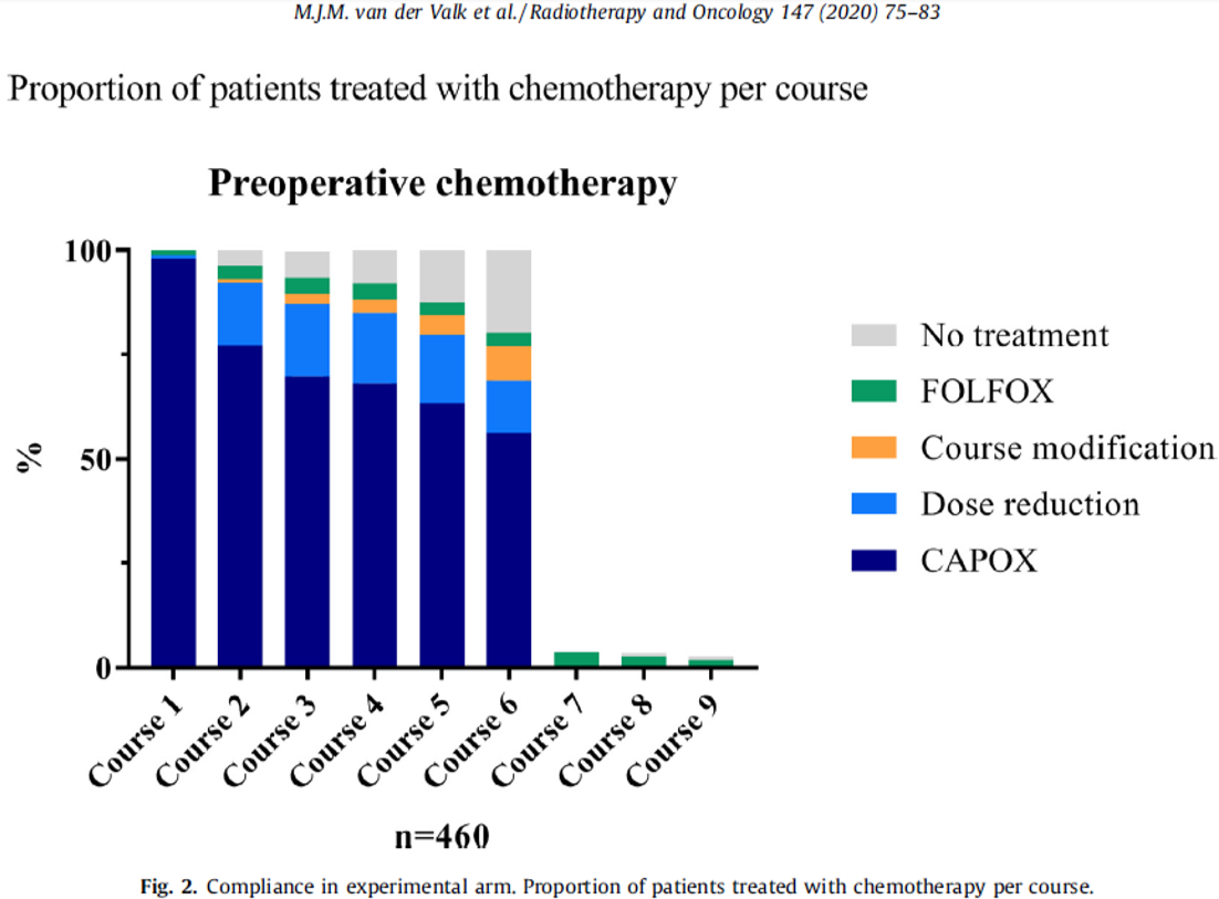 I RAPIDO-studien var det to mulige kjemoterapi-regimer etter kort strålebehandling 5 Gy x 5, enten 6 CAPOX kurer eller 9 kurer FOLFOX-4. I våre retningslinjer har vi helt gått over til å benytte CAPOX eller modifisert FOLFOX-6. Det har vært diskusjoner om antall kurer og effekt versus toksisitet (van der Valk et al., 2020).