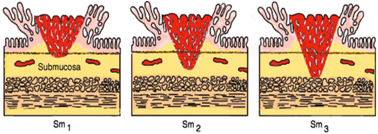 Sm-graderingen forutsetter at man finner gjennomvekst av muscularis mucosae, og at hele submucosa ned til overgang til muscularis propria er med. Klinikerne etterspør gjerne Sm selv om det ikke er mulig å vurdere dette på polyppektomipreparater.