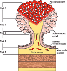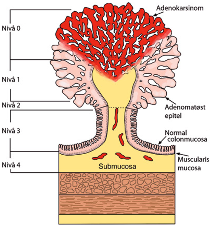 For å beskrive hvor dypt kreftceller infiltrerer i polyppøse adenomer (T1-svulster), benyttes to klassifiseringssystemer. For stilkede polypper brukes klassifisering etter Haggitt (nivå 1–4 (Haggitt et al., 1985; Rothenberger et al., 2002)). I tillegg brukes gradering for utbredelse i submucosa (Sm-gradering 1–3), som er mest aktuell i forhold til bredbasede polypper. Se tabell: