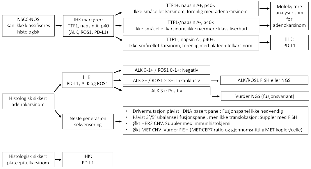 - Alle ikke-småcellete karsinomer unntatt rene plateepitelkarsinom bør undersøkes for mutasjoner i EGFR-, BRAF-, KRAS-, MET- og HER2-genene, for translokasjoner av ALK-, ROS1-, NTRK- og RET-genene, samt for fusjonstranskript mellom MET ekson 13 og ekson 15