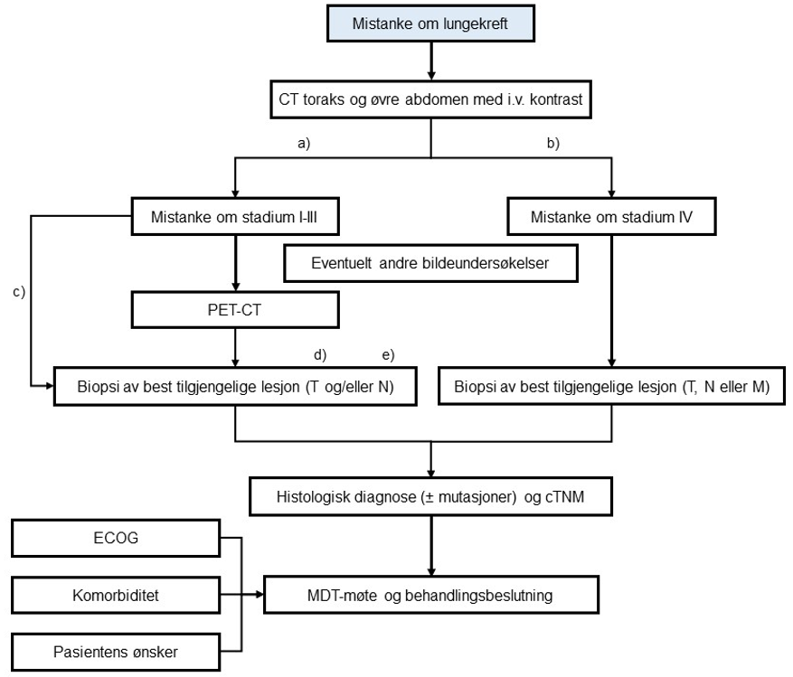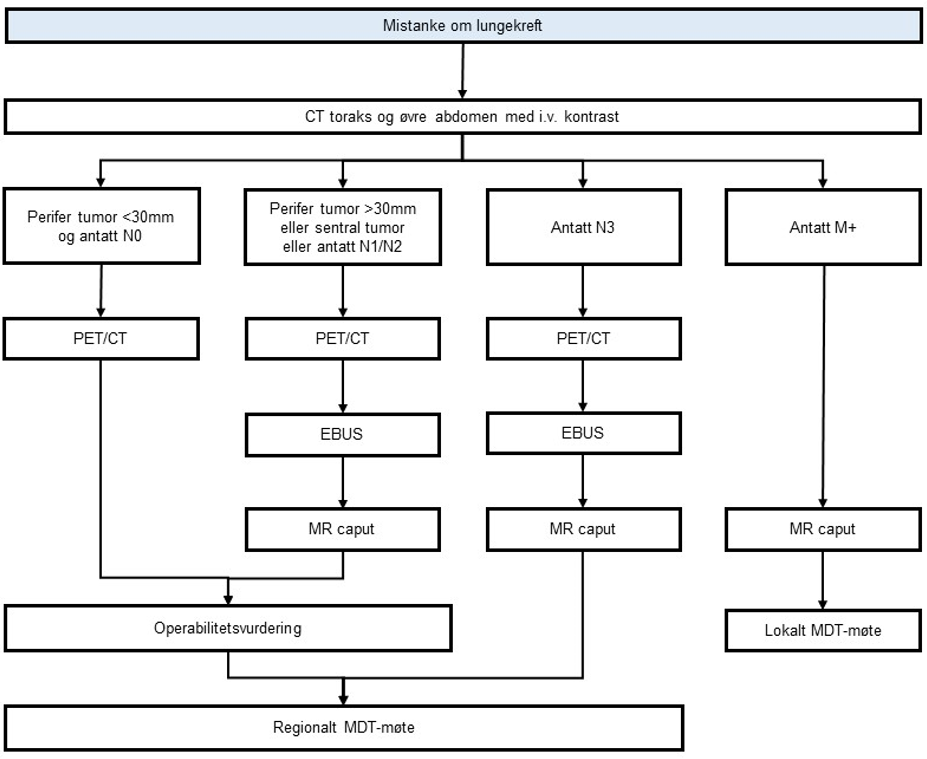 Etter innledende CT toraks og øvre abdomen med i.v. kontrast og en klinisk vurdering av om pasienten er tjent med videre utredning, foreslås det å dele pasientene inn i fire undergrupper som vist i figuren. Neste trinn vil være å vurdere hvor biopsi/cytologi enklest tas (ikke vist i figuren), bestille PET/CT og eventuell EBUS og MR caput. Rekkefølgen bestemmes i det enkelte tilfellet, men PET/CT anbefales før EBUS. Individuelle forhold skal alltid vektlegges. Modellen er et forslag og ikke en absolutt fasit. Tanken er også at man utreder mest mulig parallelt, altså at alle aktuelle undersøkelser bestilles når svaret på den innledende diagnostiske CT toraks med øvre abdomen foreligger. Figuren tar heller ikke inn i seg biopsering av primærtumor og/eller metastaser.