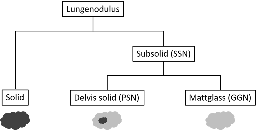 Noduli deles inn i solide og subsolide etter utseende på CT toraks (se Figur 12). En solid nodulus er røntgentett og omgitt av lungevev, den ses både i lunge- og mediastinumvindu. En subsolid nodulus framstår som et område med mattglass med eller uten områder med solide komponenter. Begrepet mattglass innebærer økt tetthet i lungeparenkymet som ikke visker ut konturene av bronkier eller blodkar (ses derfor typisk kun i lungevindu og ikke i mediastinumvindu) (Hansell et al., 2008). En nodulus kan opptre alene eller flere samtidig i en eller flere lapper, i en eller begge lunger. De er vanlige hos røykere, 39 % av deltakerne i en amerikansk screeningstudie hadde noduli > 4 mm (Aberle et al., 2011), men de ses også hos aldri-røykere.