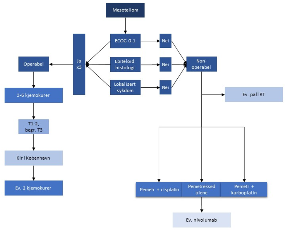 Det anbefales at pasienter som vurderes for kirurgi behandles med 3-6 kurer platinum-pemetreksed kjemoterapi neoadjuvant, og ved god toleranse og effekt kan også to adjuvante kurer vurderes.
