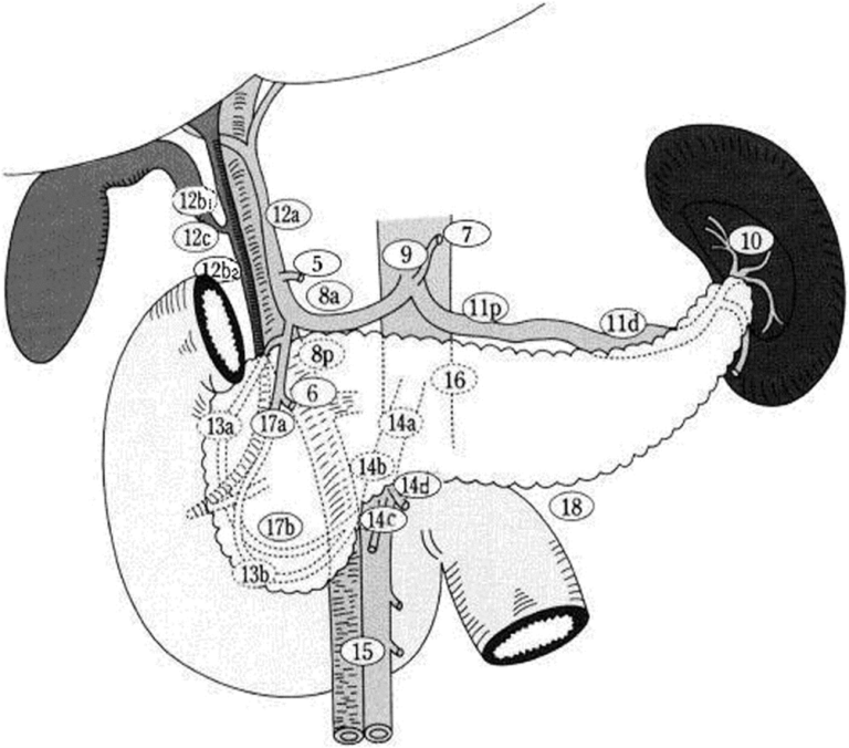Før operasjon ved pankreaskreft er det viktig å kartlegge arterieanatomien, spesielt mtp truncus coelicaus stenose og variantanatomi (akksesorisk eller avvikende avgang av a.hepatica dxt. eller a.hepatica sin.). I tillegg bør v.portae og v.mesenterica superior sitt forløp og forgreininger kartlegges. Pancreatoduodenectomi omfatter reseksjon av caput pancreatis, galleblære, distale gallegang, duodenum og første del (ca 10–15 cm) av jejunum, og ev. reseksjon av ventrikkelens distale del (antrum) (Christians et al., 2013; Whipple et al., 1935). Det er viktig å få med lymfeknuter rundt pancreasresektatet, noe som er av betydning for den postoperative stadievurderingen. Standard reseksjon av caput pankreatis omfatter disseksjon av lymfeknuter over og under pylorus (stasjon 5, 6), på høyre side av ligamentum hepatoduodenale (stasjon 12b1, 12b2 og 12c), de bakre pancreaticoduodenale lymfeknuter (13a, 13b), lymfeknuter på høyre side av a.mesenterica superior (14a, 14b), de fremre pancreaticoduodenale lymfeknuter (17a, 17b) og lymfeknuter foran a.hepatica communis (8a) (Figur 3) (Tol et al., 2014). Det er ikke vist at utvidet lymfeknutedisseksjon utover dette gir gevinst i form av bedret langtidsoverlevelse (Michalski et al., 2007). Interaortocavale lymfeknuter regnes som M+ kategori. Nytten av pancreatoduodenectomi hos pasienter med positive interaortocavale lymfeknuter er omdiskutert (Pedrazzoli, 2022).