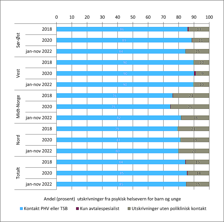 Figur 2 viser poliklinisk kontakt med psykisk helsevern og TSB i løpet av 30 dager etter utskrivning fra døgnbehandling i psykisk helsevern for barn og unge. Samlet sett hadde 85 prosent av de utskrevne pasientene en poliklinisk kontakt etter utskrivningen fra døgnbehandling i 2022. Det var i større grad poliklinisk kontakt etter utskrivning for pasientene i Vest sammenlignet med pasientene i Midt-Norge og Nord. Bidraget fra avtalespesialistene var lite i denne sammenhengen.