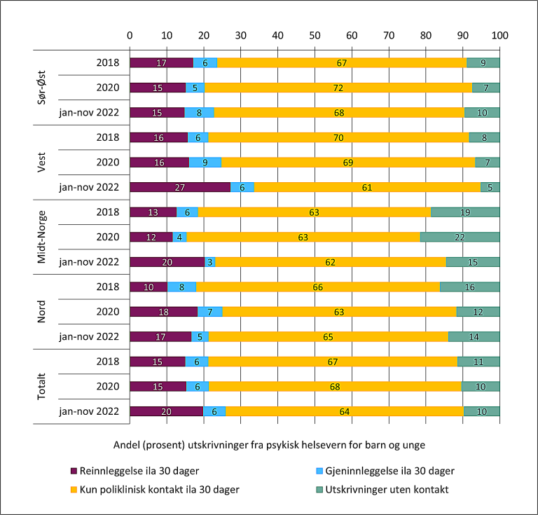 Figur 1 viser kontakt med psykisk helsevern og TSB etter utskrivning fra døgnbehandling i psykisk helsevern for barn og unge. Samlet sett var 10 prosent av døgnbehandlingene uten ny kontakt med disse tjenestene i løpet av den første måneden etter avsluttet døgnbehandling. I alt 64 prosent hadde kun en poliklinisk kontakt i løpet av disse dagene. I alt 20 prosent av utskrivningene ble etterfulgt av reinnleggelse, mens 6 prosent ble gjeninnlagt uten at det dreide seg om behov for øyeblikkelig hjelp. Det var en høyere forekomst av reinnleggelser i 2022 sammenlignet med tidligere år i alle regionene, unntatt i Sør-Øst.