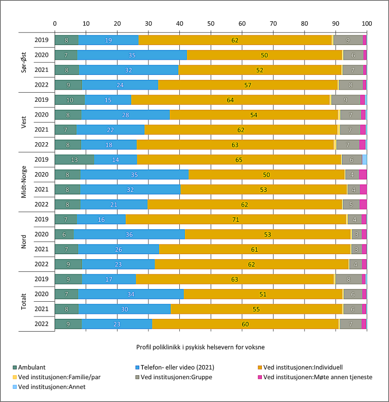 Volumet av polikliniske kontakter påvirkes av profilen i det polikliniske tilbudet. Telefon- og videokontakter er i all hovedsak mindre ressurskrevende sammenlignet med ambulant tilbud hvor behandlere drar ut fra institusjonen og oppsøker pasienten eller samarbeidende instanser for å avholde møter og samtaler relevant for behandlingsforløpet. Profilen i figur 1 gir et inntrykk av forskjeller i det polikliniske tilbudet i regionene.