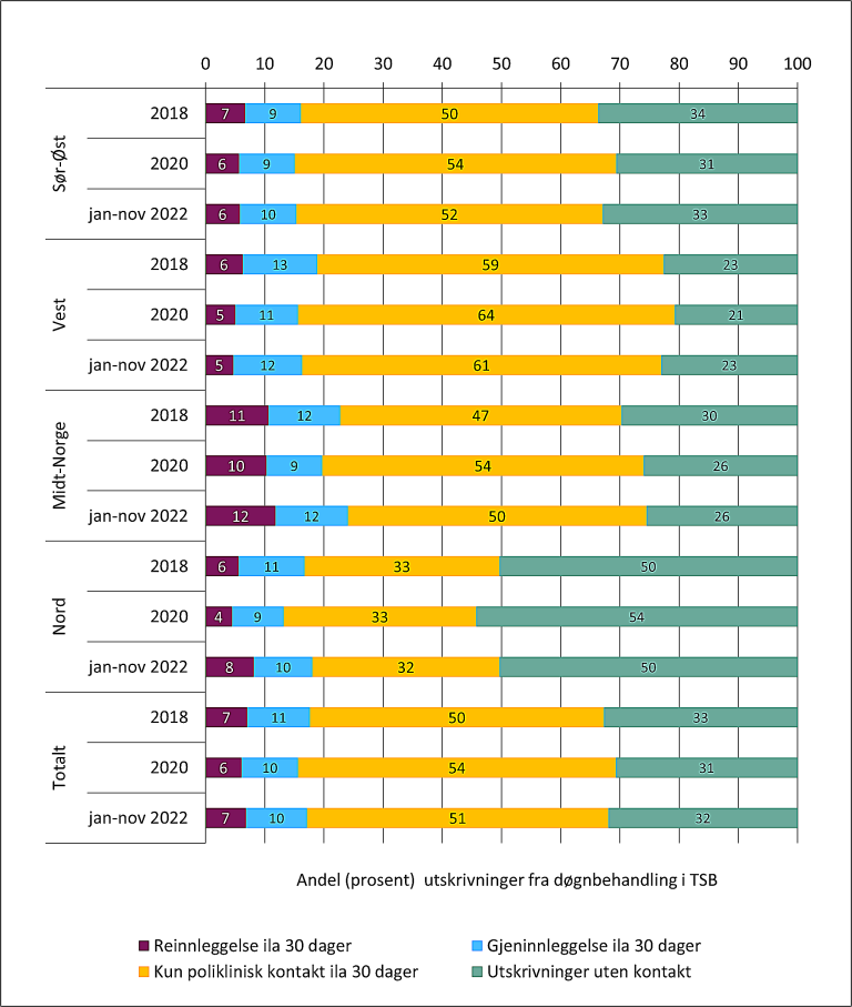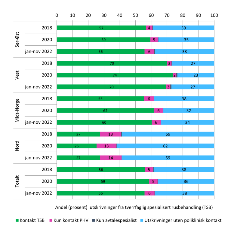 Figur 2 viser poliklinisk kontakt med psykisk helsevern og TSB i løpet av 30 dager etter utskrivning fra døgnbehandling i tverrfaglig spesialisert rusbehandling (TSB). Samlet sett hadde 62 prosent av de utskrevne pasientene en poliklinisk kontakt etter utskrivningen fra døgnbehandling i 2022. Det er i større grad poliklinisk kontakt etter utskrivning for pasientene i Vest sammenlignet med pasientene i Nord. Bidraget fra psykisk helsevern for voksne var størst i Nord, men det kan også dreie seg om organisatoriske forhold hvor f.eks. rusteamene var tillagt psykisk helsevern og ikke skilt ut i sektoren TSB.