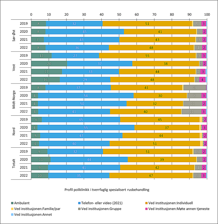 Volumet av polikliniske kontakter påvirkes av profilen i det polikliniske tilbudet. Telefon- og videokontakter er i all hovedsak mindre ressurskrevende sammenlignet med ambulant tilbud hvor behandlere drar ut fra institusjonen og oppsøker pasienten eller samarbeidende instanser for å avholde møter og samtaler relevant for behandlingsforløpet. Profilen i figur 1 gir et inntrykk av forskjeller i det polikliniske tilbudet i regionene.